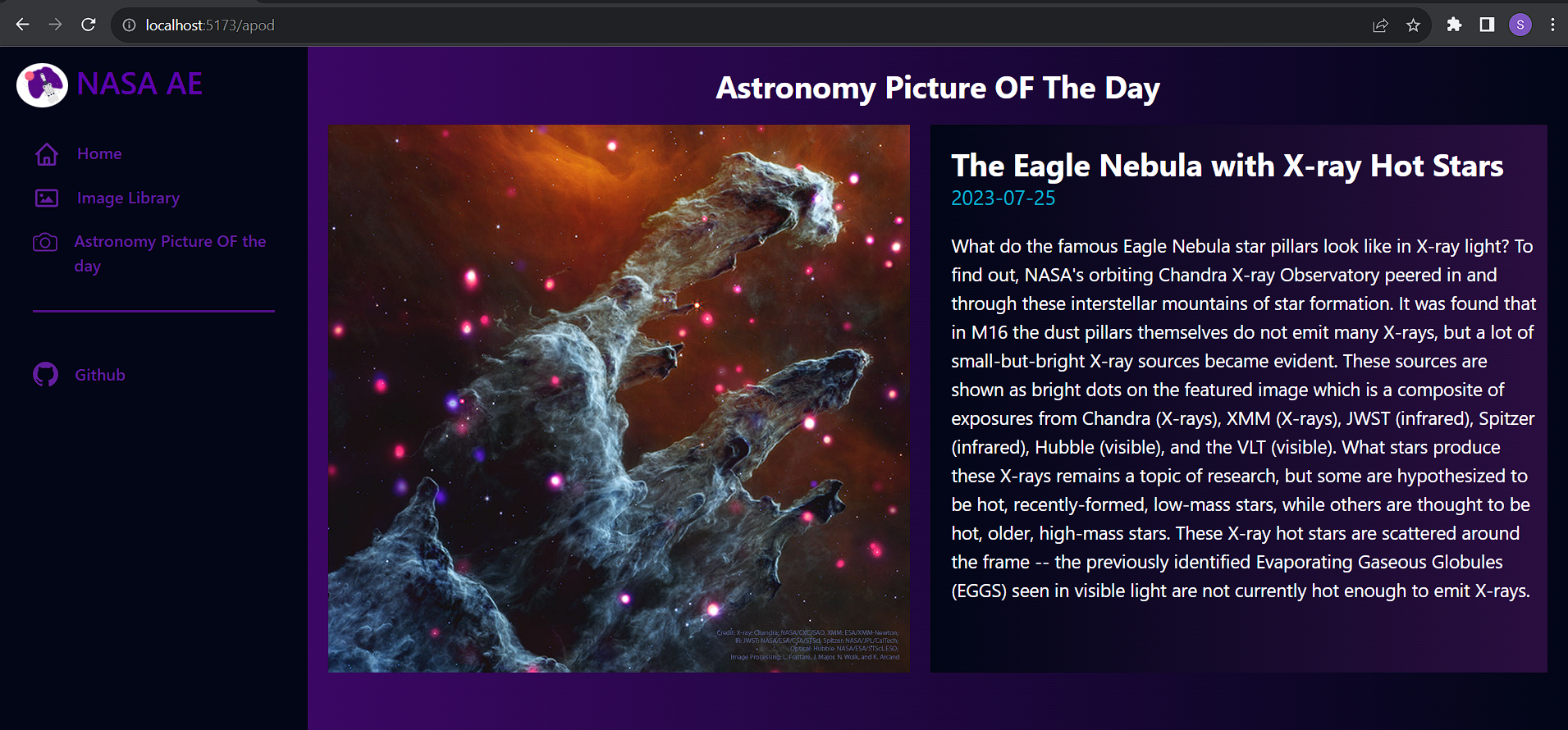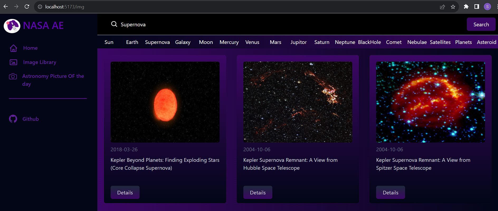 This website contains data fetch from NASA APIs.It contains Image Library by NASA and Astronomy Picture of the Day.